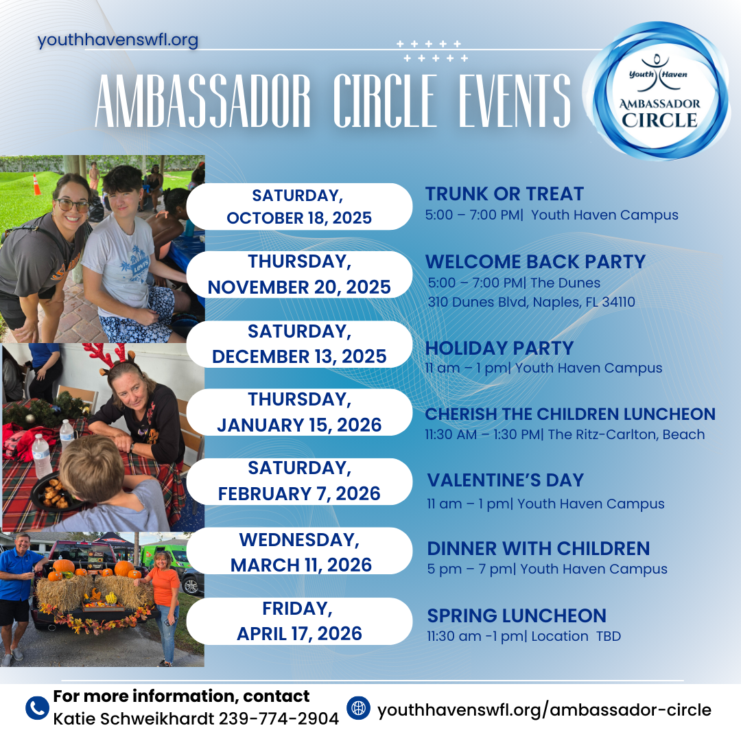To learn more about the Ambassador Circle, please contact Katie Schweikhardt at 239-774-2904 or Katie.Schweikhardt@YouthHavenSWFL.org